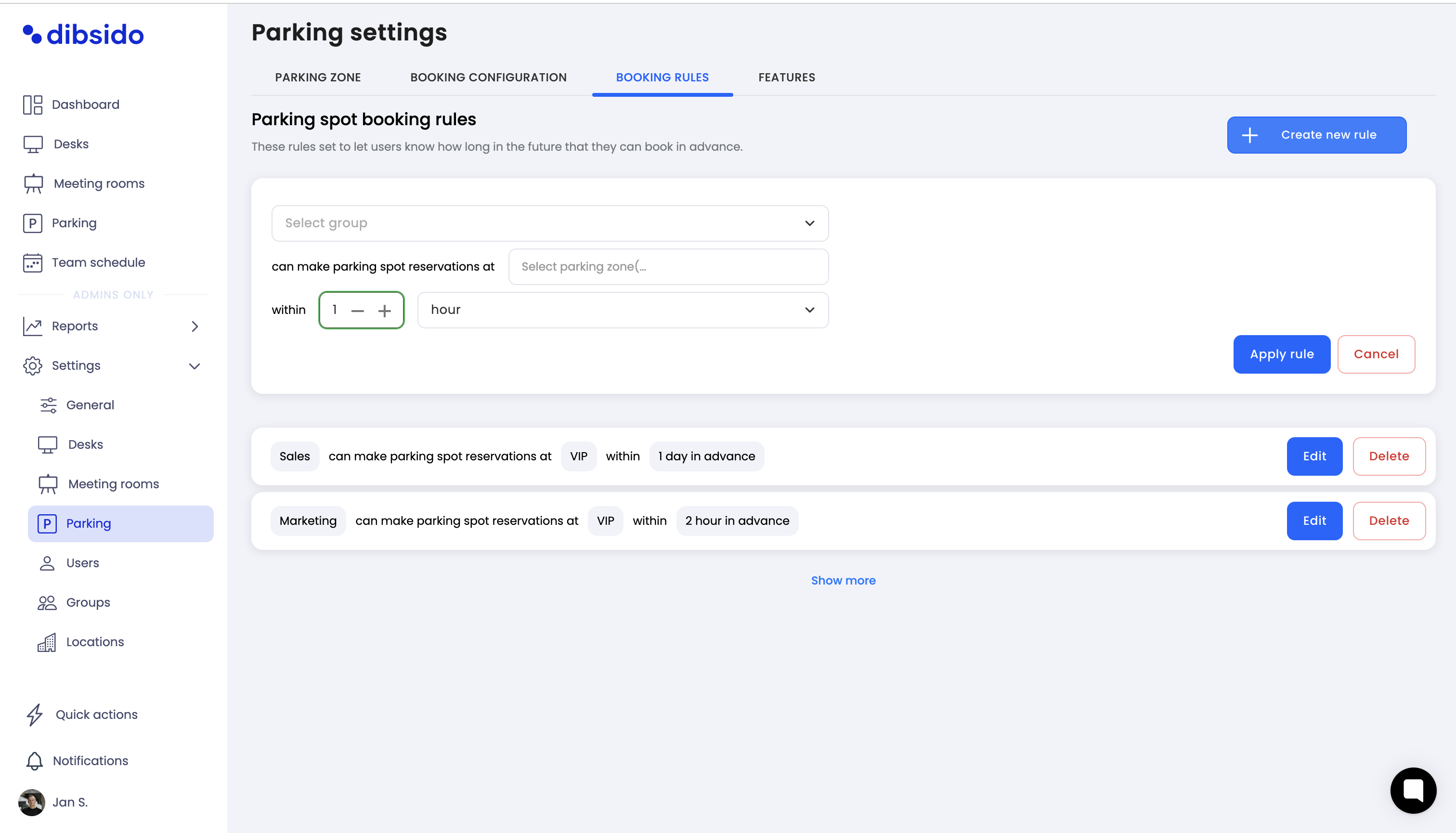 Click on the "Create new rule" button under the "Parking spot booking rules" section.