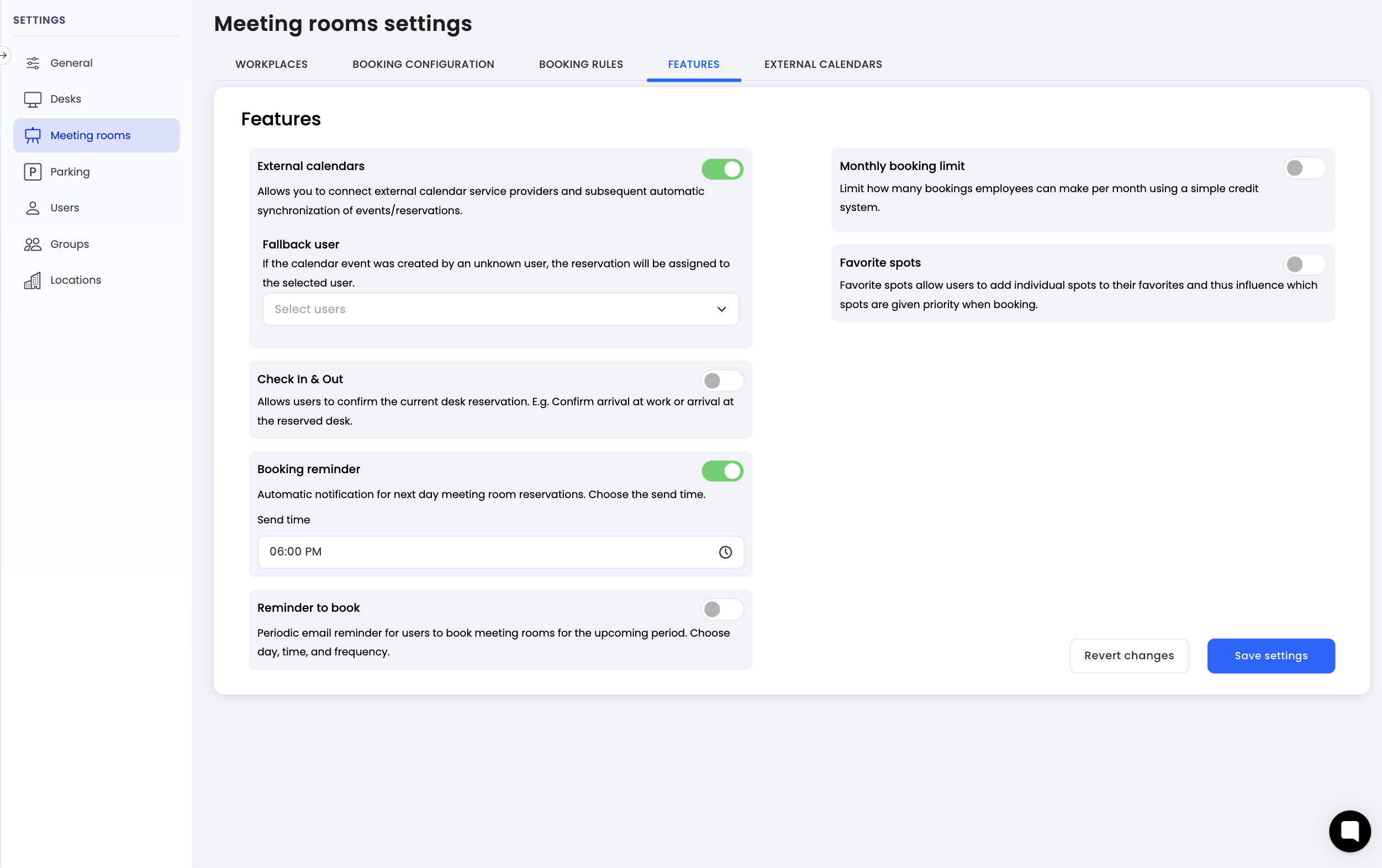 Booking reminders help employees stay on top of their meeting room reservations and reduce unused bookings. Enable the feature in the Rooms settings under the Features tab, set your preferred send time, and let Dibsido handle the rest.
