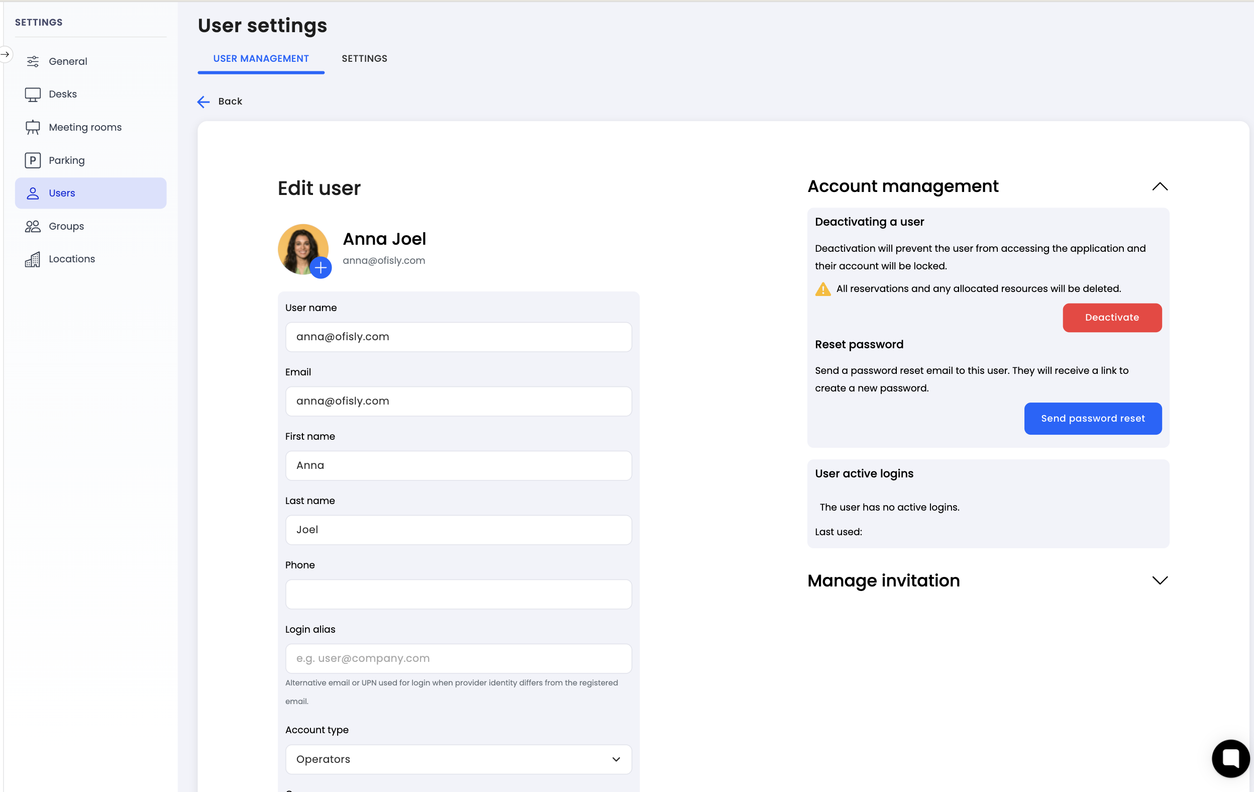 Administrators can easily initiate a password reset for any user through the user settings. Dibsido handles the rest by sending the user an email with reset instructions, allowing them to securely set a new password themselves.