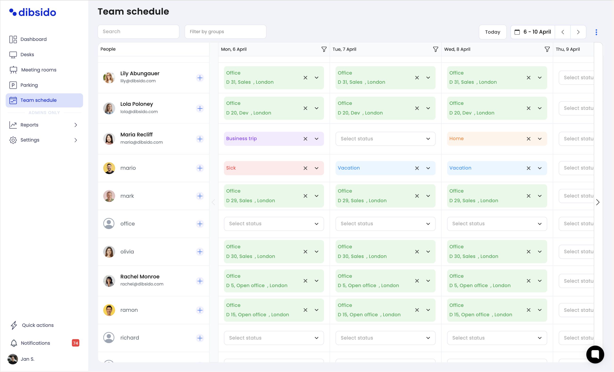 Team Schedule gives your team a clear calendar overview of who is where and what they are doing each day. Statuses are set automatically when desk reservations are made, and employees can manually add their own statuses for future days. Administrators have full control, including the ability to edit past records and export attendance data. Customize the available statuses to fit your company's needs and enable the module in the General settings.